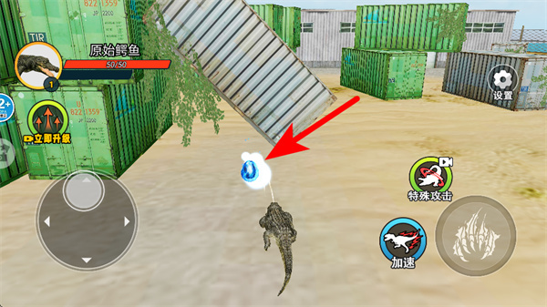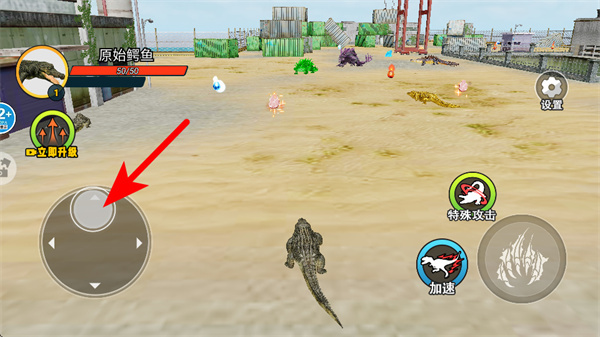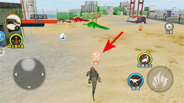 进入场景后,通过虚拟摇杆操控幼年鳄鱼在周围区域探索;当发现可食用的物品或是比自己弱小的猎物时,就主动发起攻击,以此获得经验值;要是看到大鳄鱼这类天敌,得马上躲起来,防止被它们捕食。