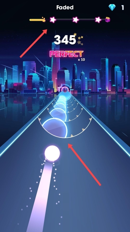 3、在游戏里,操控球体顺着轨道移动,把控好节奏,使球准确穿过光圈,得到PERFECT评价,积攒连击数,向着高分发起冲击。
