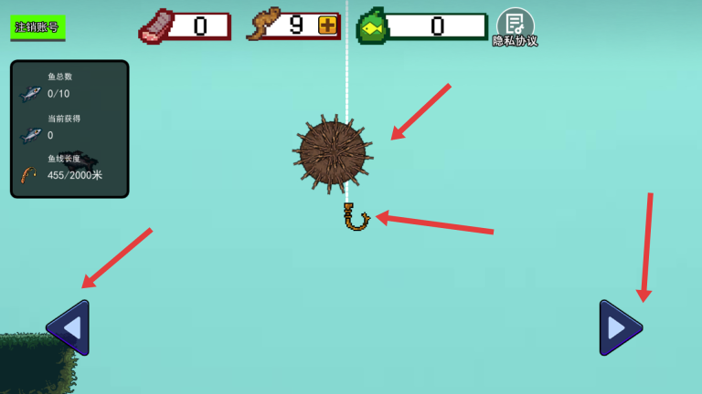 2、进入钓鱼界面后,可借助左右两侧的箭头按钮来控制鱼钩的移动,以此寻找合适的位置,进而尝试完成钓鱼操作。
