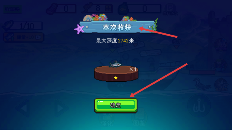 3、成功钓到鱼后,系统会弹出本次收获界面,展示所钓之鱼的相关信息,点击确定按钮即可确认收获。
