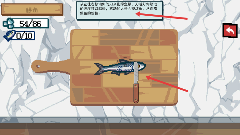 4、接下来是刮鱼鳞步骤,根据提示从左向右滑动刀具去除鱼鳞,需留意把控滑动速度,防止因速度过快弄伤鱼身,致使鱼的价值下降。