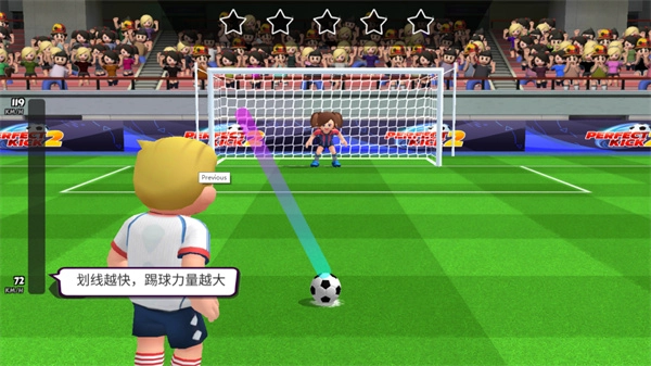2、在屏幕上朝着球门方向滑动手指,足球就会朝着你滑动的方向被踢出;滑动的速度越快,足球飞出的速度也就越快,左侧的速度表会实时显示球的速度。