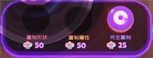 选中一颗糖后,下方会出现两个选项。一个是“提升”,用来给糖果升阶;另一个是“重制”。“重制形状”是说花果冻币改变糖果的形状,但它的属性不会变(截图里是一阶方糖,这时候对应的按钮点不了)。“重制属性”就是花果冻币修改方糖的属性,形状却保持原样。“完全重制”则是花果冻币把方糖的属性和形状一起改变。