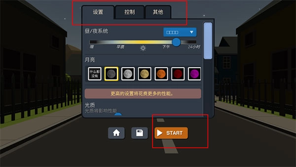 3、进入后会弹出设置界面,我们可以在这里设置月亮颜色、地图的日间与夜间时间、控制灵敏度,以及烟花发射时产生的振动等。设置完成后,点击下方的存储按钮保存设置,这样后续就无需再次手动调整了。