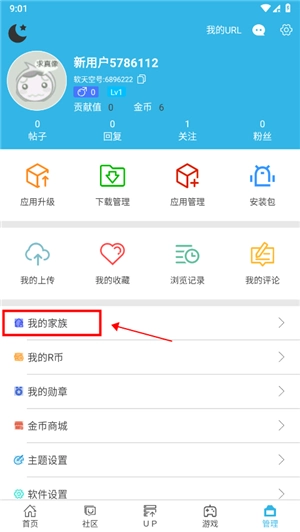1、在管理栏目,点击“我的家族”;