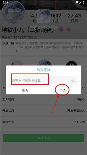 5、输入申请家族原因,点申请,会提示已提交申请;