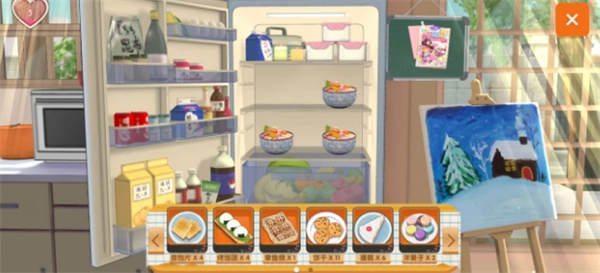要让胡桃按时吃饭,得先在【冰箱】里备好各类料理(也就是投食),像图里的面包片、饼干之类的(其他食物也行)。等饭点一到,胡桃就会自己把食物取出来摆到餐桌上吃啦。