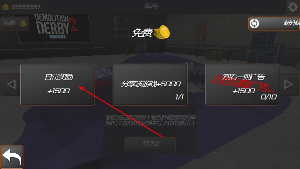 1、打开车库界面后,点击日常奖励按钮,即可获得1500金币,这些金币可用于车辆升级等资源积累,从而开启游戏内的资源获取渠道。
