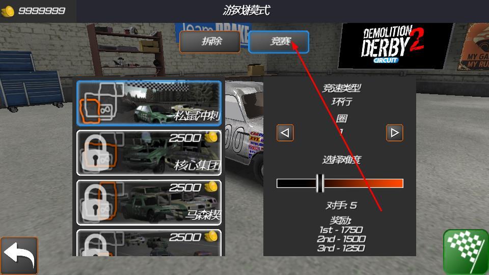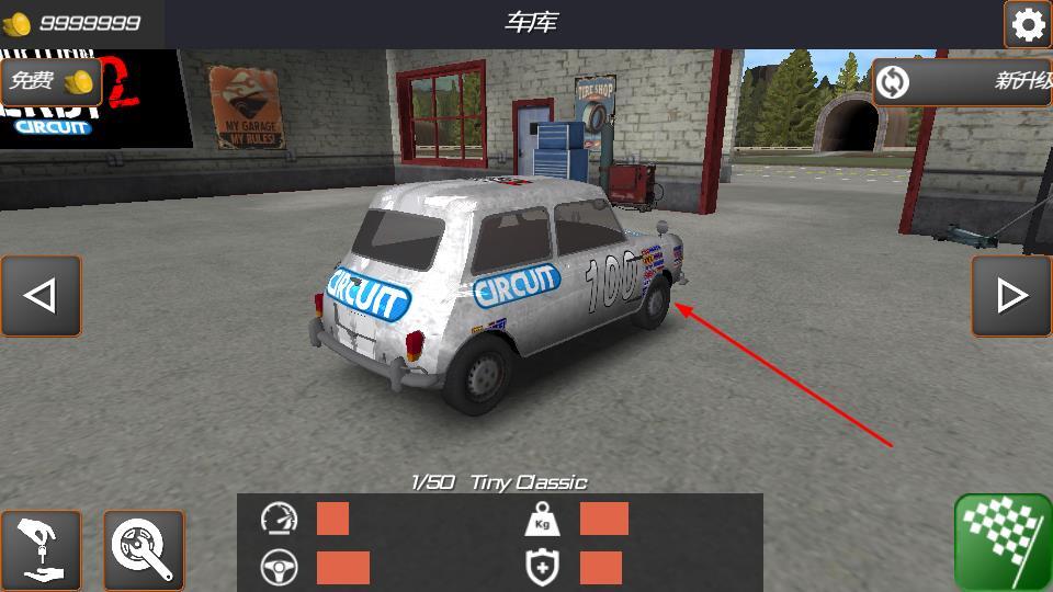 3、在车库中查看像Tiny Classic这类车辆时,能够使用金币对其进行升级;进入竞赛后,即可操控车辆参与撞击对抗类赛事。