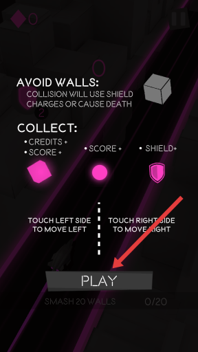1、点击PLAY即可启动游戏,请务必记住规则:要避开与墙壁的碰撞,否则会消耗护盾甚至导致游戏失败;收集粉色方块可以增加Credits和Score,收集粉球则能提升Score。
