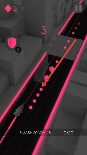 2、在游戏里操控飞船沿着粉色跑道前进,收集粉色圆点,利用护盾抵御墙体撞击,推进SMASH20WALLS任务,通过左右移动躲避障碍。