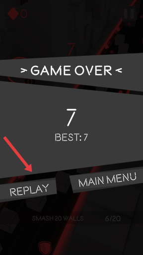 3、要是在没有护盾的状态下撞上障碍物,游戏就会结束;结算界面中点击REPLAY按钮可以重新开始游戏,目标是突破7分的最佳成绩,并完成摧毁20面墙的任务。