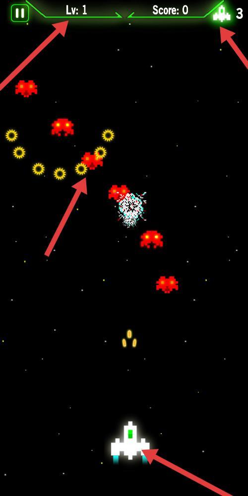 1、经典还原设计:100%复刻原版游戏的像素艺术风格,飞船外观、外星敌人等元素均完整保留,关卡架构严格遵照经典设定,其中标志性的盾牌防御系统与神秘的红色飞碟奖励机制也都原汁原味地呈现。