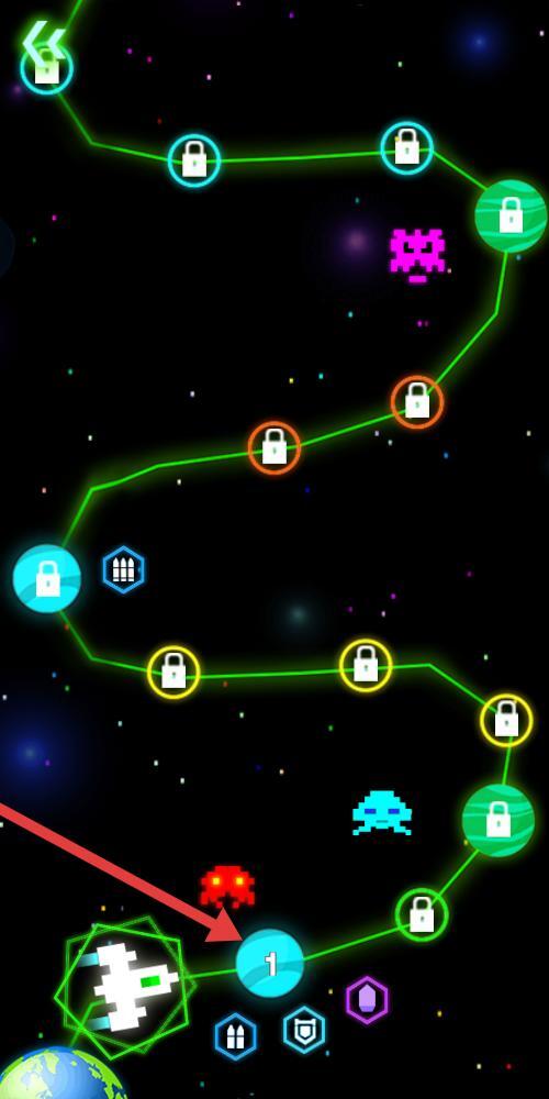 2、关卡界面以宇宙为背景,数条光带串联起散布的星球;锁形图标代表尚未解锁的关卡,而标有数字“1”的蓝色星球是第一关,点击它即可开启星际挑战之旅。