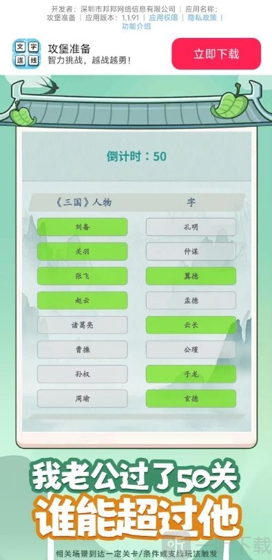 《攻堡准备》是一款以三国时代为背景的战斗策略游戏,巧妙结合了文字连线与答题玩法。玩家需凭借对三国人物和典故的了解完成答题闯关,逐步解锁英雄角色;再根据各人物的技能与属性进行组合搭配,投身对战、攻略城池,不断拓展领土,体验趣味十足的游戏过程!