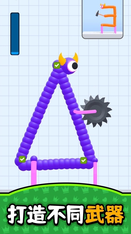 3. 配备锤子、弓箭、盾牌等30余种可拼接的武器模块,模块安装在不同部位时,会对攻击范围和招式产生影响。