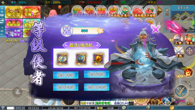 1、等级使者:提升等级需消耗星髓币、道纹币与九转金丹,这些货币可通过打怪获取。