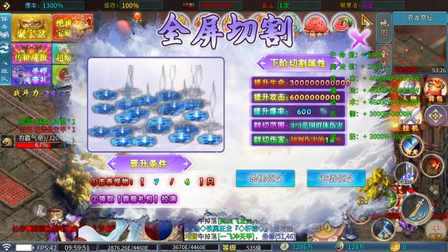 5、全屏切割:击杀怪物即可激活,后续持续打怪还能不断晋升,提升切割与群切伤害,同时也会增加爆率。
