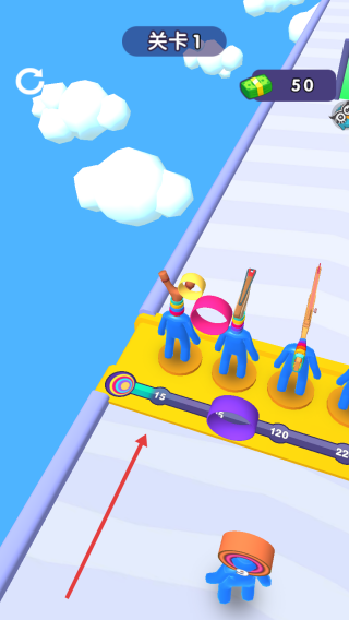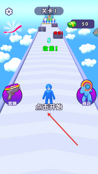 1、点击【点击开始】按钮,即可进入“关卡1”的跑道场景,画面中会呈现云朵、各类道具以及障碍,准备开启这场需要收集物品、躲避障碍的闯关挑战。