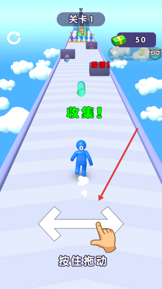 2、游戏过程中,按住屏幕下方带有“按住拖动”字样的箭头并左右滑动,即可精准操控蓝色角色移动,借此灵活避开障碍物、高效收集各类道具。