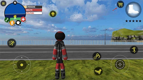 左侧控制移动与加速,右侧负责绳索操作和攻击(含跳跃功能),跳跃键独立设置;画面右上区域的武器切换界面,以及血量、经验值的动态数据均实时更新,信息清晰直观。玩家可自由选择玩法,与其他帮派成员展开激烈交火——击杀敌人能获取经验,连续击杀会累积星级,此时警察及周边角色将对你发起针对性攻击。如何在枪林弹雨中存活,同时完成对其他目标的击杀,正是你需要达成的核心任务。
