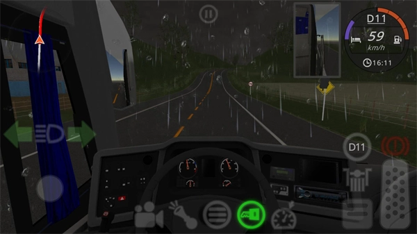 3、车辆启动后,左侧控制车辆转向,右侧负责油门与刹车操作,屏幕左上方则显示地图及导航指引。