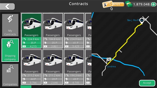 6、点击contracts按钮能够承接各类任务,点击accept按钮即可接取任务,接取任务后地图上会出现红色线条引导玩家前行,到达终点就能完成任务并获取奖励。