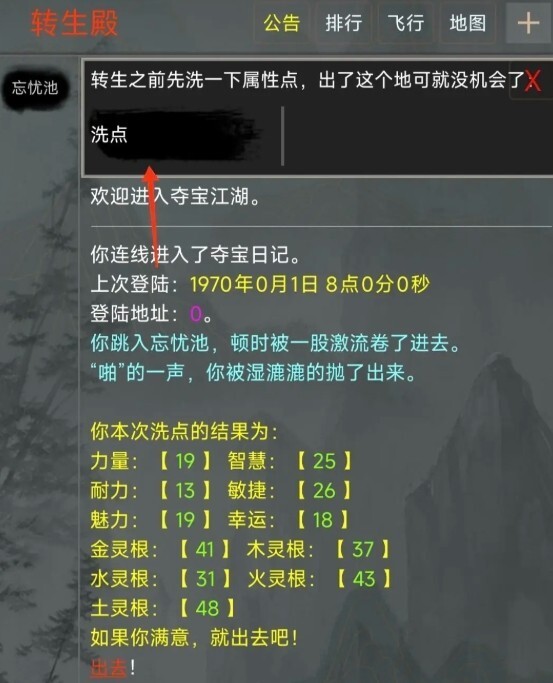 刷到满意的属性后,点击属性下方标红的“出去”字样,就能踏入夺宝江湖了。