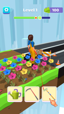 1、在不同场景中挑选对应的道具,化身为合适的职业继续探索,例如在土地场景选择水壶,就能让前方的土地绽放出一片花田。