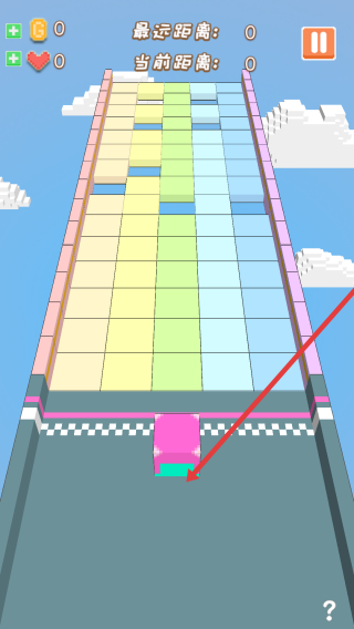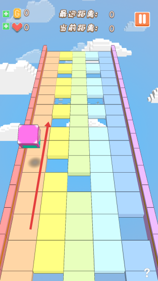 1、进入跑酷界面后,方块会自动向前移动,玩家需通过左右滑动屏幕操控方块的移动方向,避开跑道上的缺口等各类障碍物。