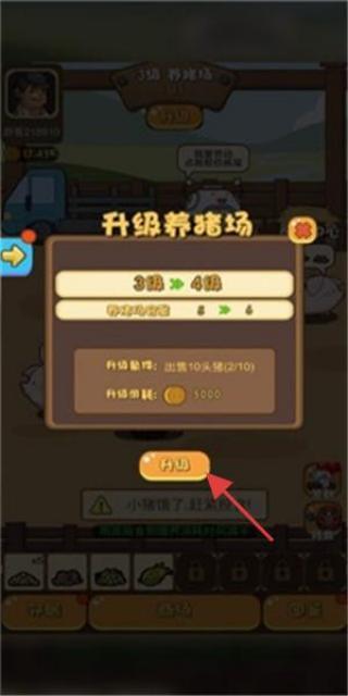 2、点击进入“升级养猪场”界面(红箭头所指位置),消耗1000金币,将养猪场等级从3级提升至4级,以此实现产能扩容。