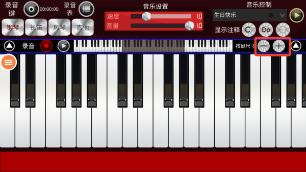 2. 如下图右侧红色框标注的区域,点击其中的加减按钮,可对钢琴键进行缩放或放大操作,以此满足不同玩家的弹奏需求。