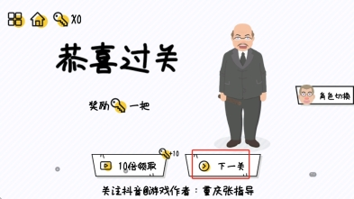 3、成功到厕所过关后,界面显示恭喜过关,可点下一关按钮进新挑战,也能看广告10倍领钥匙。