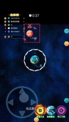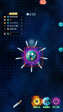 2、若发现红框内标注着“进攻”的星球,就驾驶带有光环的己方星球靠近它,灵活运用各项技能来击破其防御,将该星球消灭掉,以此积累击杀数量,从而稳固自己的排名。