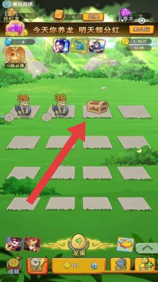 1、在游戏主场景中,找到箭头所指的宝箱并点击,开启后可获取奖励与资源,这些资源能用于养龙、合成等操作,助力推进游戏进度。
