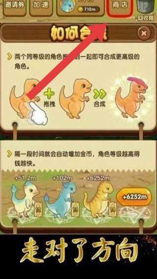 2、进入商店界面后,按照箭头的提示查看合成规则与收益规则,借助“两个相同等级的角色可合成更高等级角色”这一玩法,来提升龙的等级。