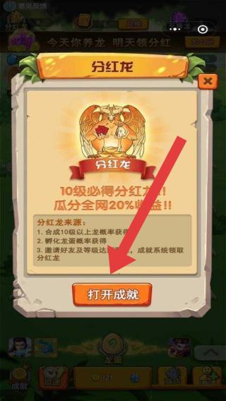 3、进入分红龙界面后,点击【打开成就】按钮,查看获取分红龙所需满足的条件(例如合成10级及以上的龙等),完成对应的任务即可参与分红。