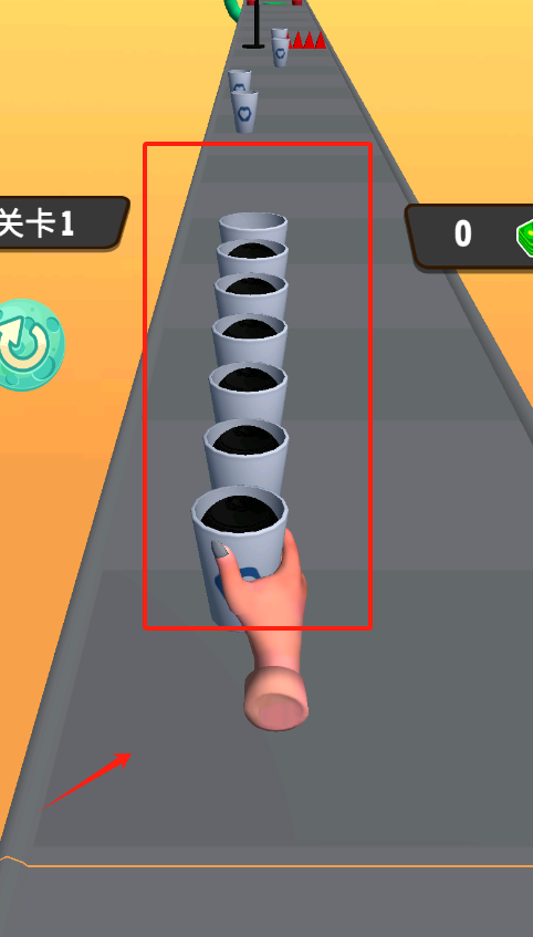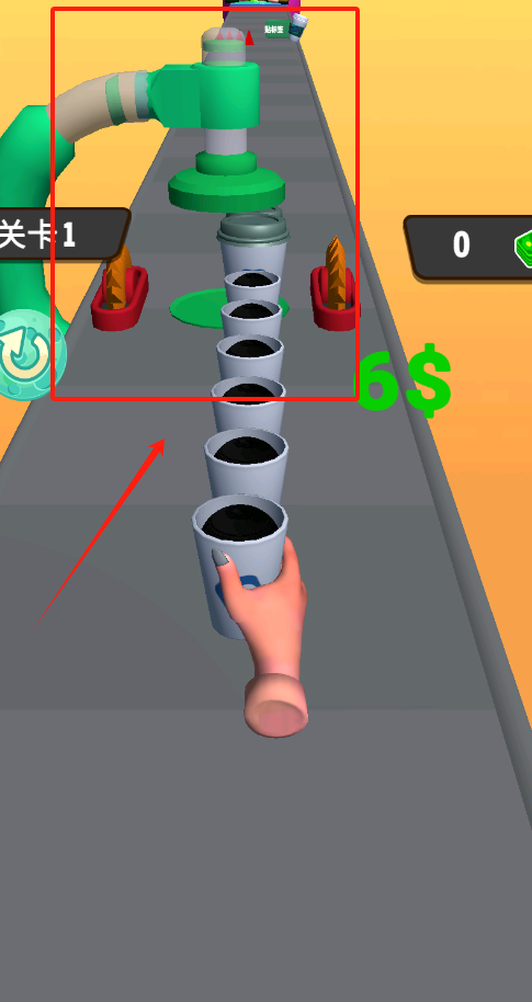 3、传送带上杯子依次排列,根据上方绿色机械装置的提示,用手指点击下方伸向杯子的手,以此控制杯子完成关卡获取分数。