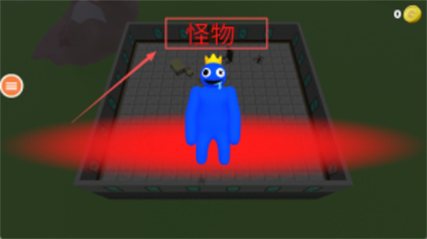 2、当戴着皇冠的蓝色角色被标记为怪物时,请依据红色箭头的指引来操作,同时注意平台下方的红色危险区域以及右上角的金币数量。