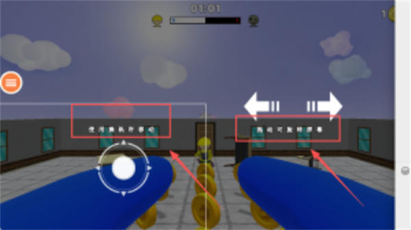 游戏开始后,用底部的白色摇杆操控角色移动,按照红色框里的提示滑动屏幕来瞄准射击,同时留意左上角的倒计时。