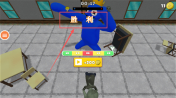 4、当角色头顶出现胜利标识时,查看获得的+200金币奖励,点击左下角橙色按钮进入下一关,注意右上角数字11所代表的关卡进度。