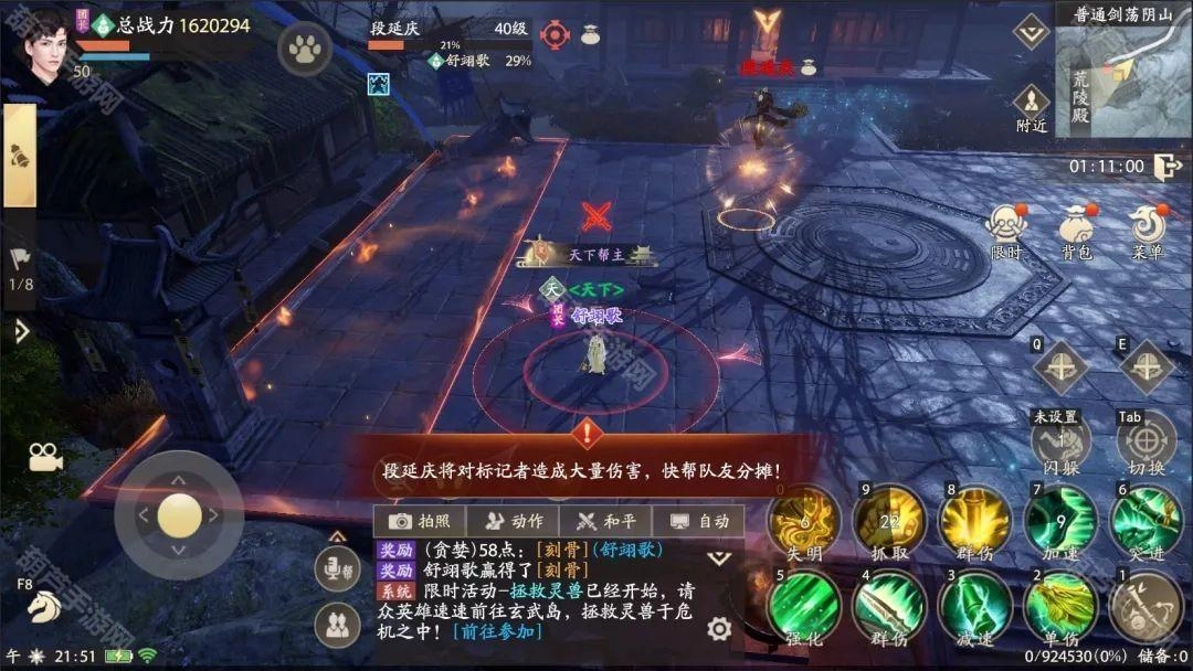 段延庆对标记目标造成的伤害可由目标周围的单位分摊,并且会在技能落点附近形成火焰陷阱。