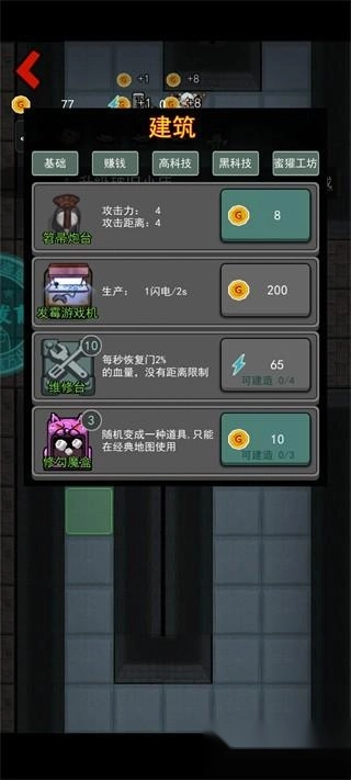 1、在“建筑”界面的“基础”分类中,花费8金币建造笤帚炮台,这是前期性价比最高的防御武器。