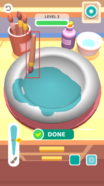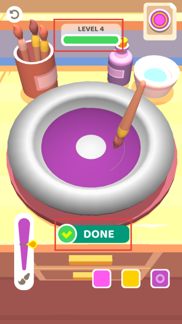 4、到了关卡4,我们得用画笔蘸取紫色颜料,依照给定的图案为盘子上色,等涂抹完毕后点击【DONE】按钮,这样一个漂亮的盘子就制作完成了。