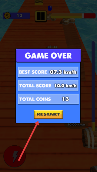 3、当游戏失败后,屏幕会显示“GAME-OVER”界面,此时点击【RESTART】按钮,系统将扣除一定数量的金币(例如13个),即可重新开启该关卡的挑战。