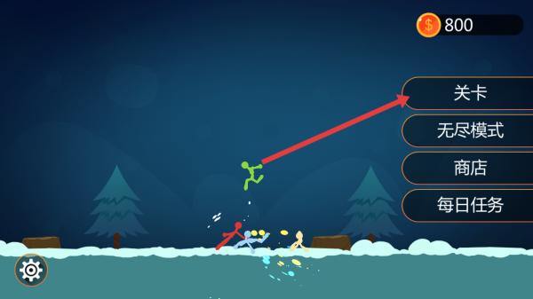 2、在关卡模式界面,根据箭头的指引,选择初级战斗分类下的1号关卡,进入该关卡后即可开启火柴人战斗任务。