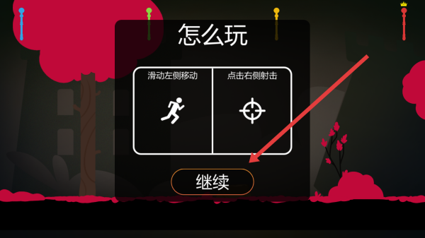 3、进入玩法说明界面后,在了解滑动左侧可控制移动、点击右侧可进行射击的玩法规则并观察完毕,接着点击继续按钮,即可进入战斗环节。
