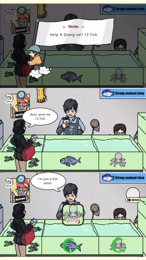1. 玩家既能和顾客交谈,知晓他们的需求与故事;也能查看鱼缸,发现藏在里面的物品。