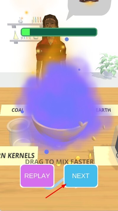 3、若合成失败或成功,根据结果点击REPLAY重新实验或NEXT进入下一轮,尝试完成制作挑战。