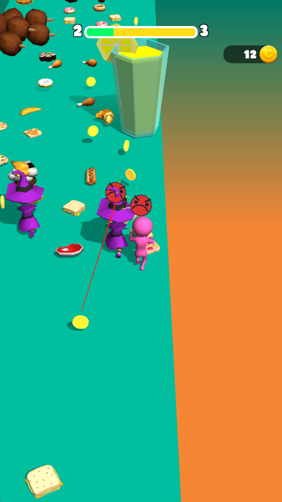 2、当遇到其他小人的冲撞干扰时,要迅速点击屏幕进行跳跃来躲避,或者借助弯道的切线技巧拉开彼此的距离;要是不小心发生碰撞,就得马上捡起掉落的食物,确保食物塔的高度不会低于通关所要求的最低标准。
